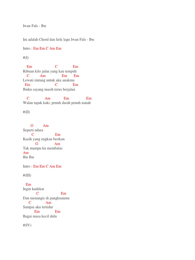 1 1218K Ibu Lyrics Lirik Ibu - Iwan Fals Intro Verse 1 Ribuan kilo jalan yang kau tempuh Lewati rintang untuk aku anakmu Ibuku sayang masih terus berjalan Walau tapak kaki penuh. Due to a planned power outage on Friday 114 between 8am-1pm PST some services may be impacted.